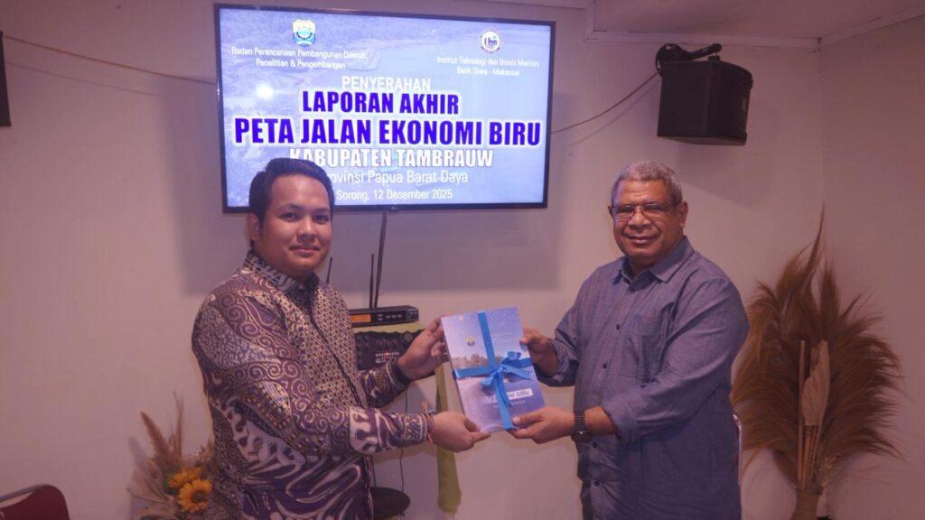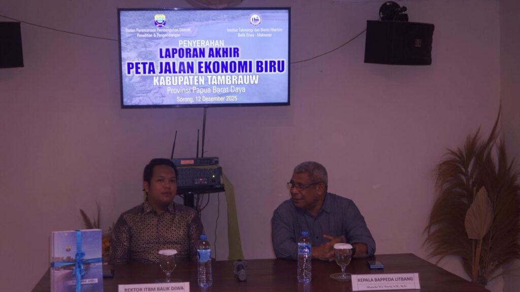 Tambrauw, 12 Desember 2025 – Institut Teknologi dan Bisnis Maritim Balik Diwa (ITBM Balik Diwa) secara resmi menyerahkan Laporan Akhir Peta Jalan Ekonomi Biru Kabupaten Tambrauw, Provinsi Papua Barat Daya kepada Pemerintah Kabupaten Tambrauw melalui Bappeda Litbang Kabupaten Tambrauw.